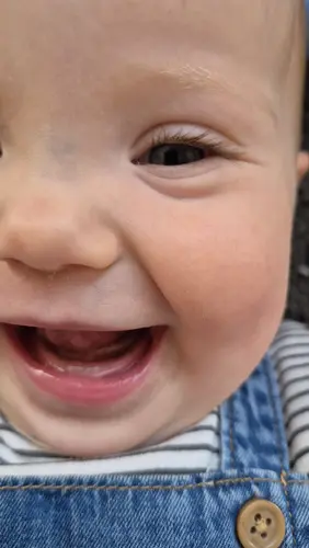 Zo van de foto zou ik niet zeggen dat dit tandjes zijn. Zou ook wel heel vroeg zijn nog. Klinkt meer als handjes ontdekken. Hier had ze met 6 maanden de eerste tanden (kwamen er toen 4 tegelijkertijd) nu is ze net 8 maanden en heeft ze er 8. Ze ging toen echt meer bijten op dingen en nog meer kwijlen dan ze al deed