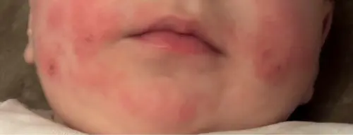 Mama's help! Mijn zoontje van 8 maanden is zojuist wakker geworden met enorme uitslag + korstjes op zijn wangen en kin. Ik schrok me kapot! Wat kan dit zijn!!??? Hij is eczeemgevoelig. Hij krijgt volledig borstvoeding.