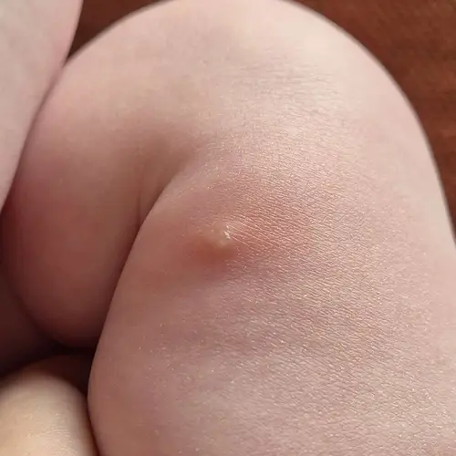 Iemand die dit herkent en weet wat dit is? Mijn zoontje heeft al sinds week 3 een rood verdikt bultje op zijn been. Cb weet niet wat het is. Nu vandaag, hij is nu 18 weken, zit er een vochtblaasje op.