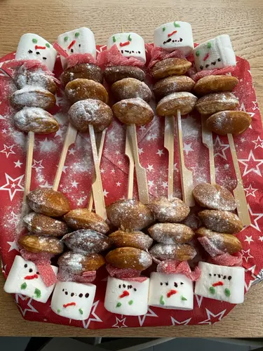 De poffertjes zoals hieronder gepost zijn ook altijd erg populair, maar vaak ook meerdere keren aanwezig. Kerstpannenkoekjes doen het ook altijd goed. En de knakworstjes in bladerdeeg.