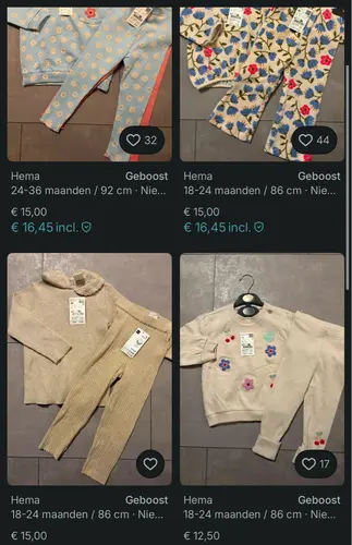 Ik snap het sowieso niet helemaal van geloof ik. De prijzen zijn erg hoog voor Vinted, vind ik. Op dit moment heeft de HEMA uitverkoop, dus voor €5 koop je soortgelijke setjes van legging & trui: https://www.hema.nl/baby/babykleding/setjes/baby-kledingset-bloemen-ecru-33048070ECRU.html