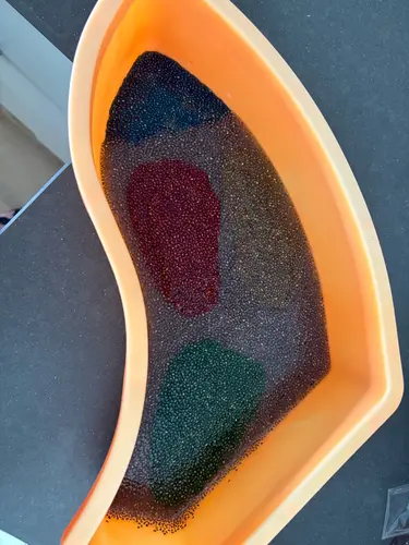 Speelplezier: uuuuuuuuren (alleen niet achter elkaar ;)). Heb ook diverse houten attributen nog erbij: schepjes, nins, vulvormen, pincetten. En ook andere sensorische vulling nog: veertjes, ponpons, andere kleuren rijst, speelpasta, gekleurde witte bonen etc.