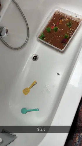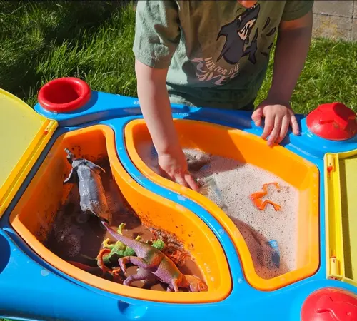 Hier ook voor de watertafel een 'modderbak' gemaakt met cacaopoeder, bloem en water en in de andere en water met wat dreft, sponsje en afwasborstel. Wat diertjes erin en hij heeft zich zonder grappen dik 3 uur vermaakt. En later die week nog eens.