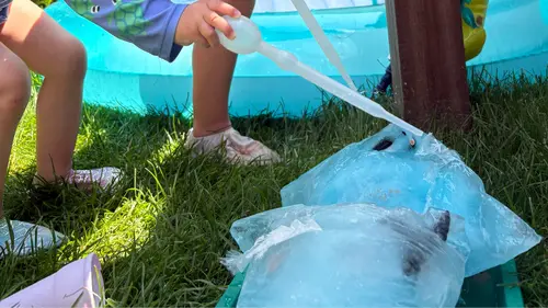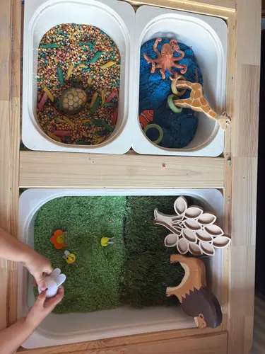 In verschillende varianten in gebruik, vandaag is het zee met strand, en land. En wordt er gespeeld met land- en waterdieren (en ‘mama ik heb de giraf zwembandjes gegeven want die kan niet zwemmen’ 😄)