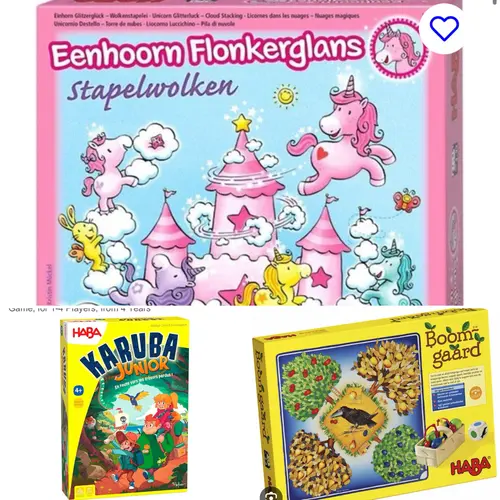Nu zijn eenhoorn Flonkerglans en Karuba junior bij mijn dochter (bijna 4) favoriet en ik vind deze zelf ook leuk om te spelen. Van de boomgaard spellen zou ik dan de originele grote versie kiezen, deze is een stuk leuker dan de andere versies! Daarnaast vindt ze gewoon kwartet en memorie ook nog steeds leuk.