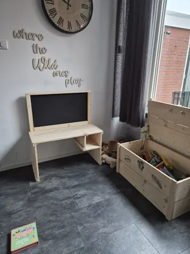 Wij hebben een grote rieten kist met deksel die hij zelf openkrijgt met daarin het meeste van zijn speelgoed. Daarnaast staat een speelgoedkeukentje!