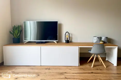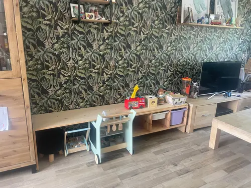 Wij hebben niet veel ruimte en moeten ook een nieuw tv meubel,vandaar dat ons dit dan praktisch leek en ook nog beetje leuk eruitzien. De box moet dan eerst de deur uit..maar hij zit, tijgert, kruipt nog niet, dus box is nog wel handig nu.