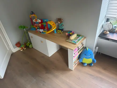 Wij hebben zoiets (open vak in het midden), maar dan volledig als speelhoek voor peuter. In de laden zitten bakken voor treinspoor, duplo, etc. Kind heeft nog een lade in de normale boekenkast voor klei, spelletjes en puzzels. Wij doen aan toy rotation, andere speelgoed staat nu op zolder. Maar vind dat toch wel veel heen en weer gesleep. Dus misschien straks een deel stallen op peuterslaapkamer of in de trapkast.