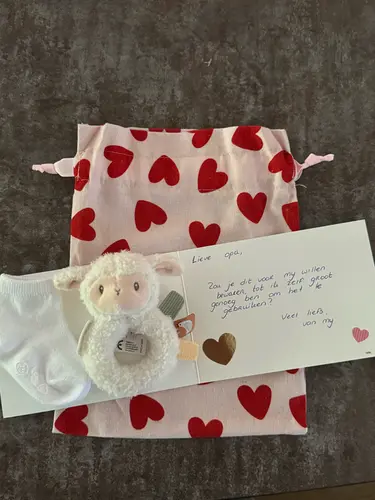Wij hebben een zakje gemaakt destijds, met een kaartje, rammelaartje en sokjes: