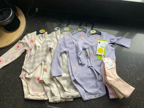 Bij de HEMA in ons dorp waren alle rompers van de oude collectie (en sowieso alle sale items) 70% korting. Deze rompers + sokjes had ik voor €17,40 totaal :)
