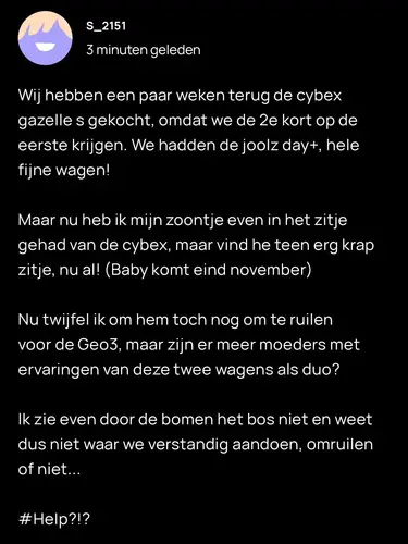 Wij hebben nu een paar dagen de Joolz Geo3. 2e Kindje is er nog niet, maar we gebruiken hem wel als duo met een zak aardappelen in de reiswieg (馃槀) om ons zoontje eraan te laten wennen. Heerlijk groot zitje en hij zit er goed in! Ja de boodschappen mand is een nadeel, maar met een grote tas of het zij mandje mis ik hem eigen niet. Heel blij met onze keuze