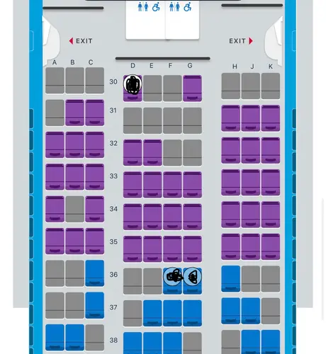 Kan jij de paarse stoelen allemaal kiezen? Want het is wel raar dat 30 E+F geboekt zouden zijn door koppel met baby, die hebben dan toch F+G nodig want anders hangt de baby voor een vreemde op stoel G?