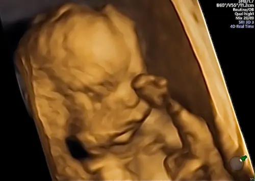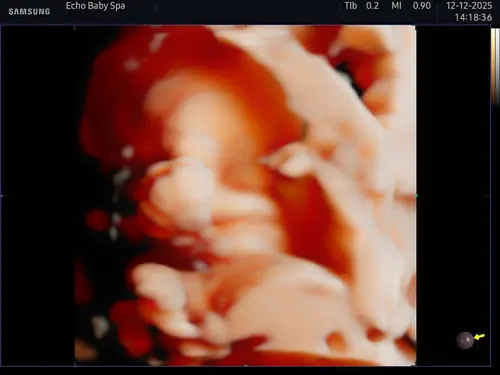 Use only the uploaded 3D ultrasound image as the source. Apply very subtle enhancement, as if the ultrasound machine settings (brightness, contrast, sharpness) were slightly improved. Preserve the exact position, orientation, angle, rotation, and proportions of the baby. Do not move, reshape, or reposition anything. The goal is to make the face more clearly recognizable as a baby, by: gently clarifying existing facial features (nose, lips, eyelids, chin) using only information logically present in the original ultrasound strictly following the original pixel structure and depth cues Not allowed: no new details no smooth skin no photorealistic lighting no beautification no artistic interpretation Visual style: Must remain clearly a real medical 3D ultrasound, with visible noise, shadows, irregularities, and depth. The result should look like the ultrasound was slightly clearer, without the baby changing position by even a millimeter.