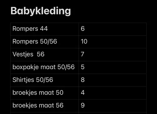 Ik heb van alle maatjes 50/56/62 minimaal 4 van alles. 4 rompers, 4 broekjes, 4 shirts/truitjes met lange mouwen. En dan heb ik in elke maat nog 1 of 2 boxpakjes.