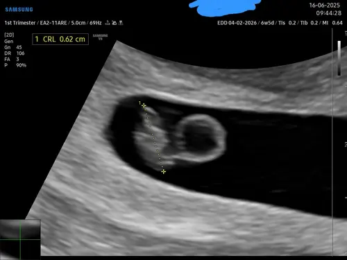 Een kloppend hartje! Super blij. 馃槃 Het is 6.2 mm en 3 dagen vroeger dan dat we dachten. De verwachte datum is nu 7 februari. Ze gaf wel aan dat het moeilijk te zien is, het is nog zo klein.