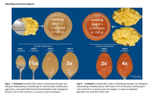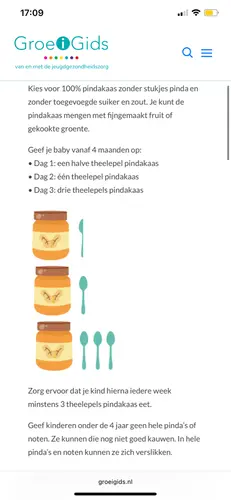 Ik kreeg dit schema van CJG ivm eczeem bij de kleine. Dit is du een stuk voorzichtiger dan het eerder gedeelde schema van de GroeiGids. Je mengt de pindakaas door een voeding heen en start dan een halve theelepel van dat gemengde potje.