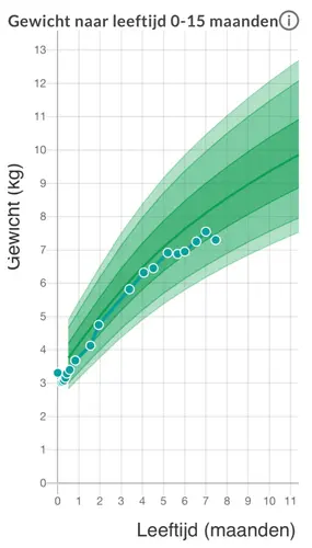 Hey ik loop tegen hetzelfde aan. Onze zoon is bijna 8 maanden en weegt momenteel 7200 gram. Hij komt wat aan, valt weer wat af is frequent ziek met koorts en drinkt daarbij slecht. 3x150 en 2x180 krijgt hij aangeboden maar hij laat gewoon zeer frequent 90-120cc staan.