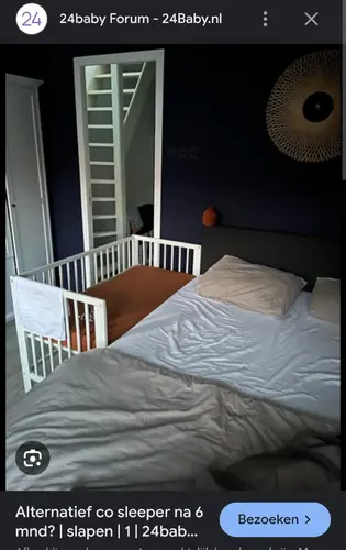 Ik vond deze foto op internet en dit is precies wat ik bedoelde. De spandband moet om het ledikant en het onderstel van het bed (dus niet om de matrassen). Eventueel een handdoek oprollen als er te veel ruimte zit tussen het matras en ledikantmatras (wel met elastiekjes ivm stikgevaar) aan de spijlenkant als je. zoekt op gulliver cosleeper of diy cosleeper vind je wel wat! Op instagram heb je happycosleeper waar heel veel informatie staat. En natuurlijk als je kind gaat staan zeggen ze dat de spijlen hoger moeten.. mijn zoon nu 2 heeft altijd zo geslapen en dat ging goed.