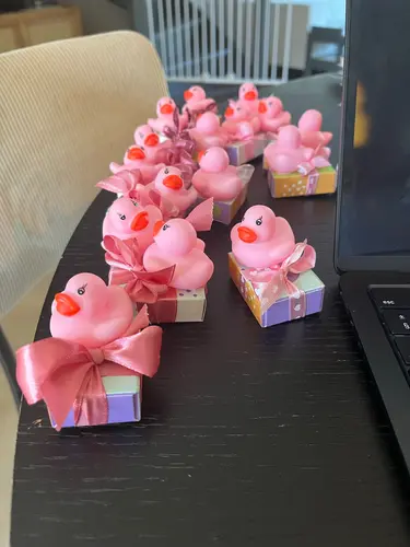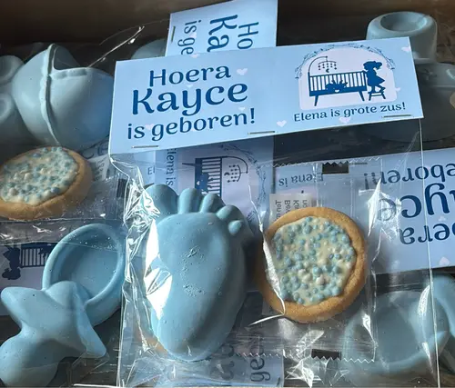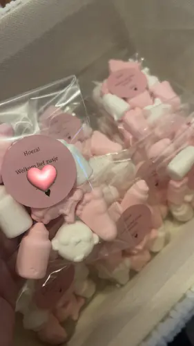 Ik heb zakjes met hartjes patroon doorzichtig en afsluit stickers met naam en daar in gaan schuimpjes in vorm van speentjes kinderwagen wiegje enzv en dat in kleur wit roze