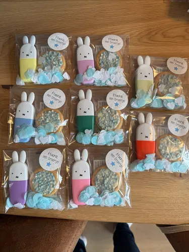 Ik heb deze klaar liggen voor mijn dochter om te trakteren voor groep 1/2. Stoepkrijt en een apart verpakt geboortekoekje!
